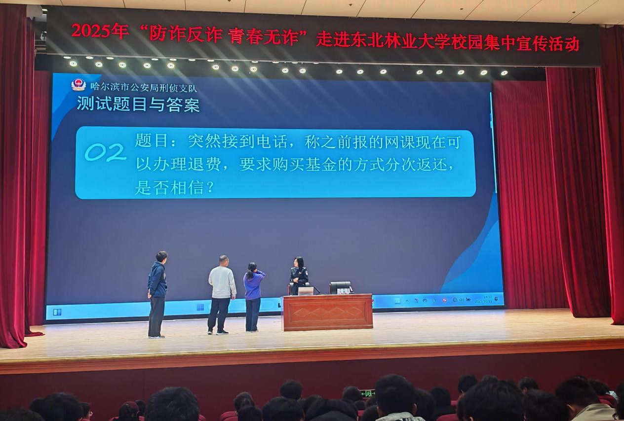 为深入贯彻习近平总书记关于打击治理电信网络诈骗犯罪工作的重要指示精神,切实提高师生识诈、防诈、反诈能力。10月11日下午,党委保卫部和学生工作部共同邀请哈尔滨市公安局刑侦支队电诈犯罪侦查大队三中队教导员、全省公安系统十佳主持人、全省十佳反诈宣传员陈思思警官,为师生们做“防诈反诈·青春无诈”的主题宣讲。共有1300余师生参加活动。